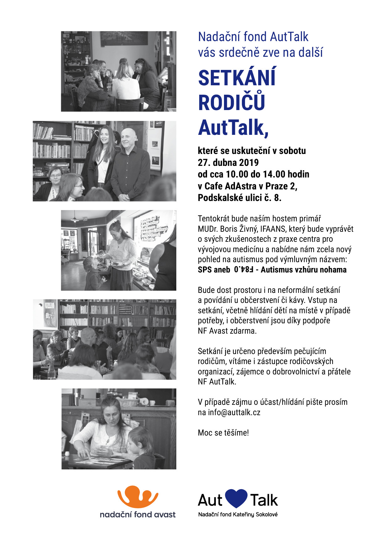 Díky podpoře NF Avast pořádáme 27. dubna další setkání rodičů a přátel NF AutTalk v Café AdAstra. Pozvání přijal MUDr. Boris Živný, aby se podělil o své zkušenosti z praxe neurologa a my pevně věříme, že jeho neobvyklý pohled bude pro rodiče inspirací. Kromě přednášky bude jako vždy prostor pro zastavení a popovídání se starými i novými známými. Cafe AdAstra připraví občerstvení a samozřejmě bude k hlídání dětí přímo v prostoru kavárny v případě potřeby.