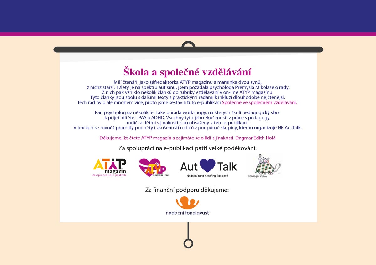Společné vzdělávání je citlivá věc. Vyžaduje spolupráci dítěte, rodičů, asistenta pedagoga, třídního učitele, ostatních učitelů i ředitele školy a odvahu, odhodlání, optimismus a podporu všech zúčastněných. Doufáme, že takovou podporu by mohla přinést brožura Společně ve společném vzdělávání, kterou připravil zkušený psycholog pan Přemysl Mikoláš, tým magazínu Atyp a Nadačního fondu AutTalk díky podpoře NF Avast.